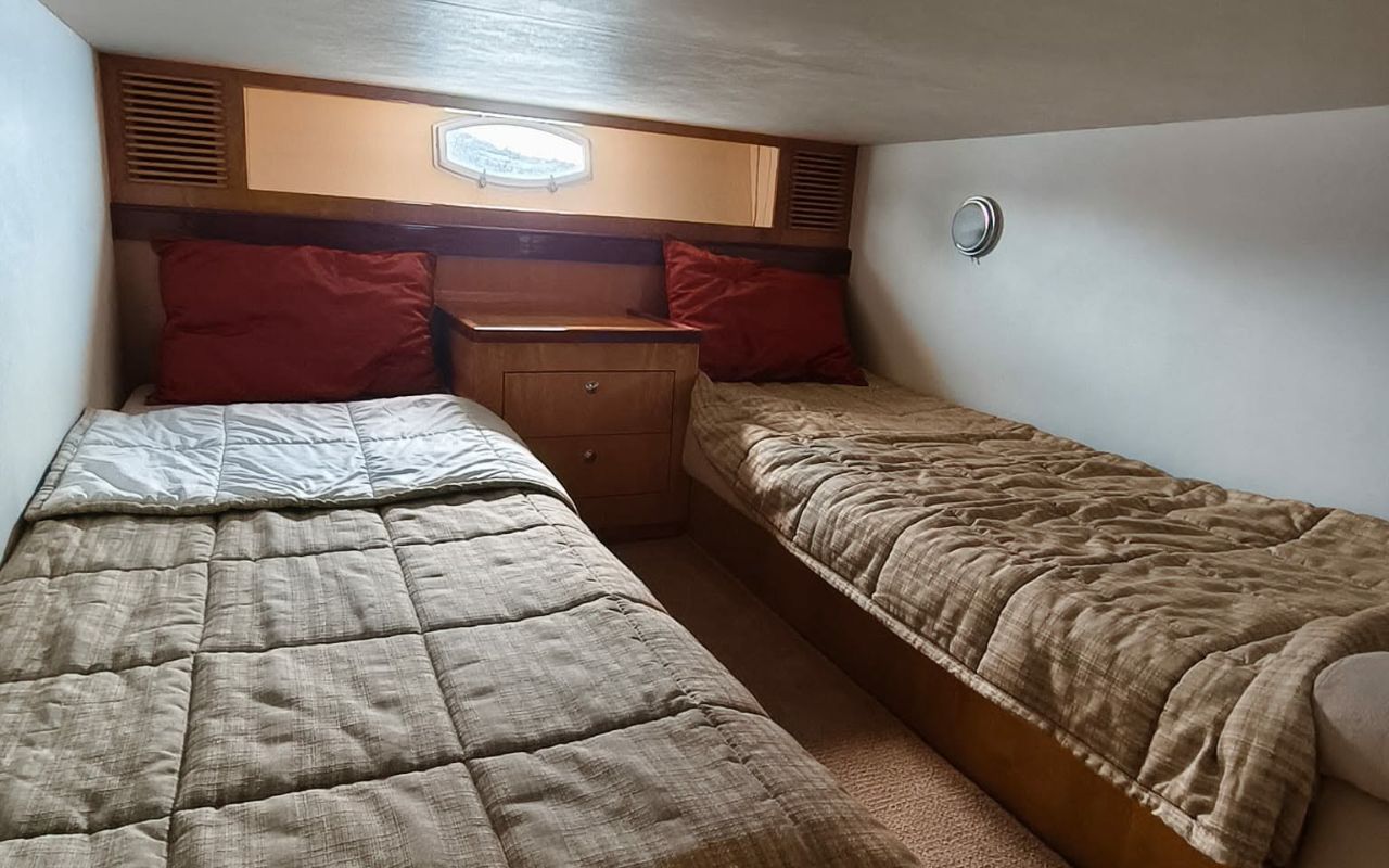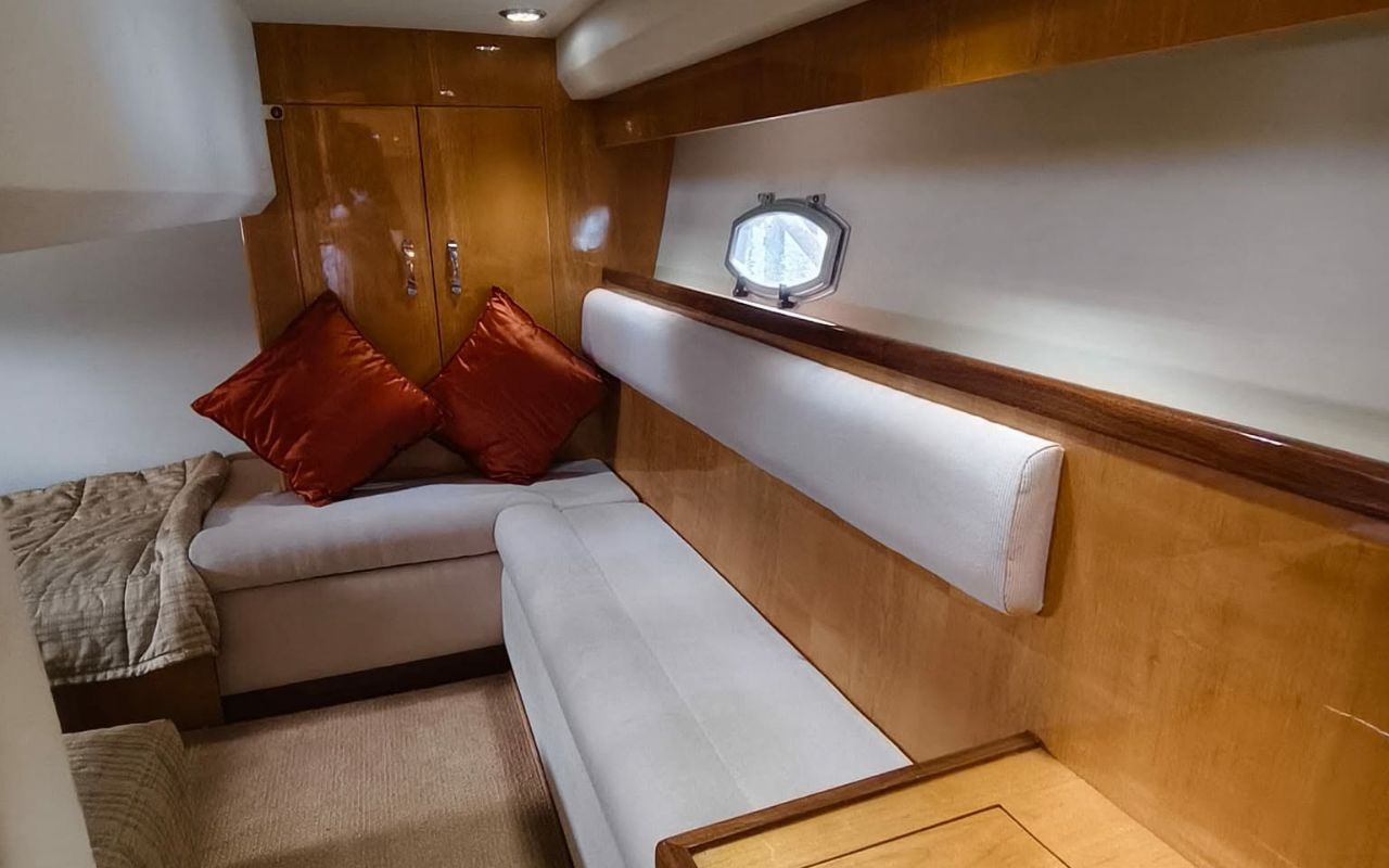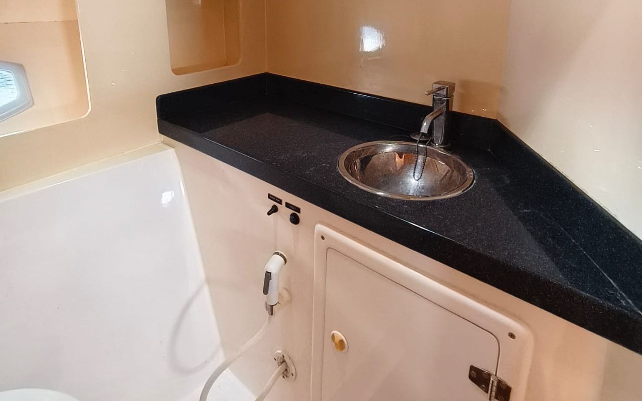 Inside, the air-conditioned saloon features plush seating and a functional galley, creating a comfortable retreat during the day. Below deck, two well-appointed cabins provide space to relax and unwind.