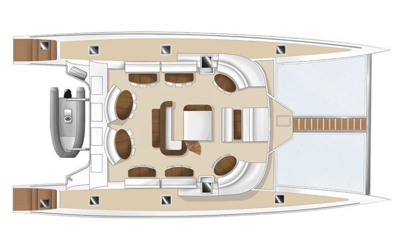 Designed for day charter, this maxi-catamaran is totally adapted to her function : Protected by a roof, the platform can host up to 66 passengers, comfortably seated around 6-people tables, protected from the sun and rain but still well ventilated so that everybody can enjoy their trip in the best conditions. The big front trampoline is a must for jumping or sunbathing, but if you prefer chatting with your friends while enjoying the sun we invite you to the sofas located on the roof.