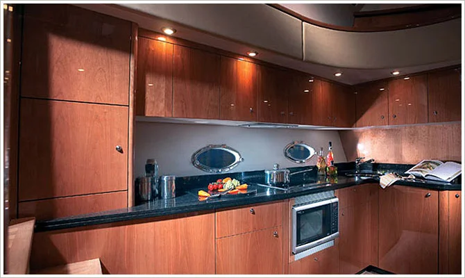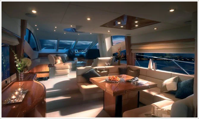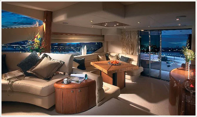 The lounge of the Sunseeker 60 yacht comes fitted with air-conditioning along with soft seating that allows guests to relax and stretch out to have a great time onboard. You will also find a central table to share drinks and meals together.