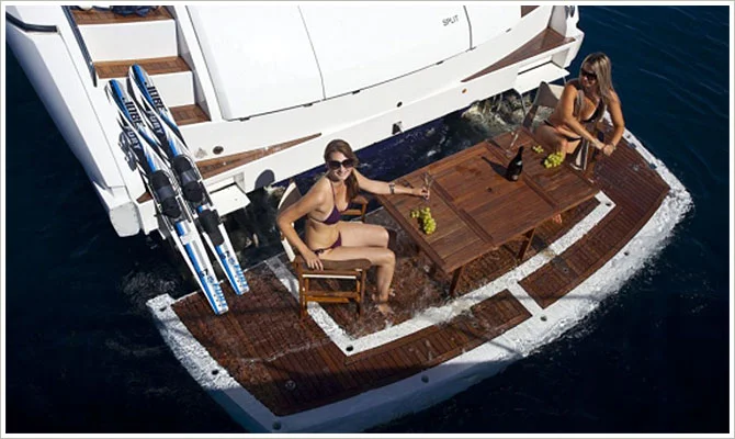 A Bose sound system and TV with DVD player provide music and entertainment, with an onboard library or, if you prefer, your own collection of sound and video. A swimming ladder and shower on the hydraulic swimming platform allow easy and safe bathing, and easy access to the tender.